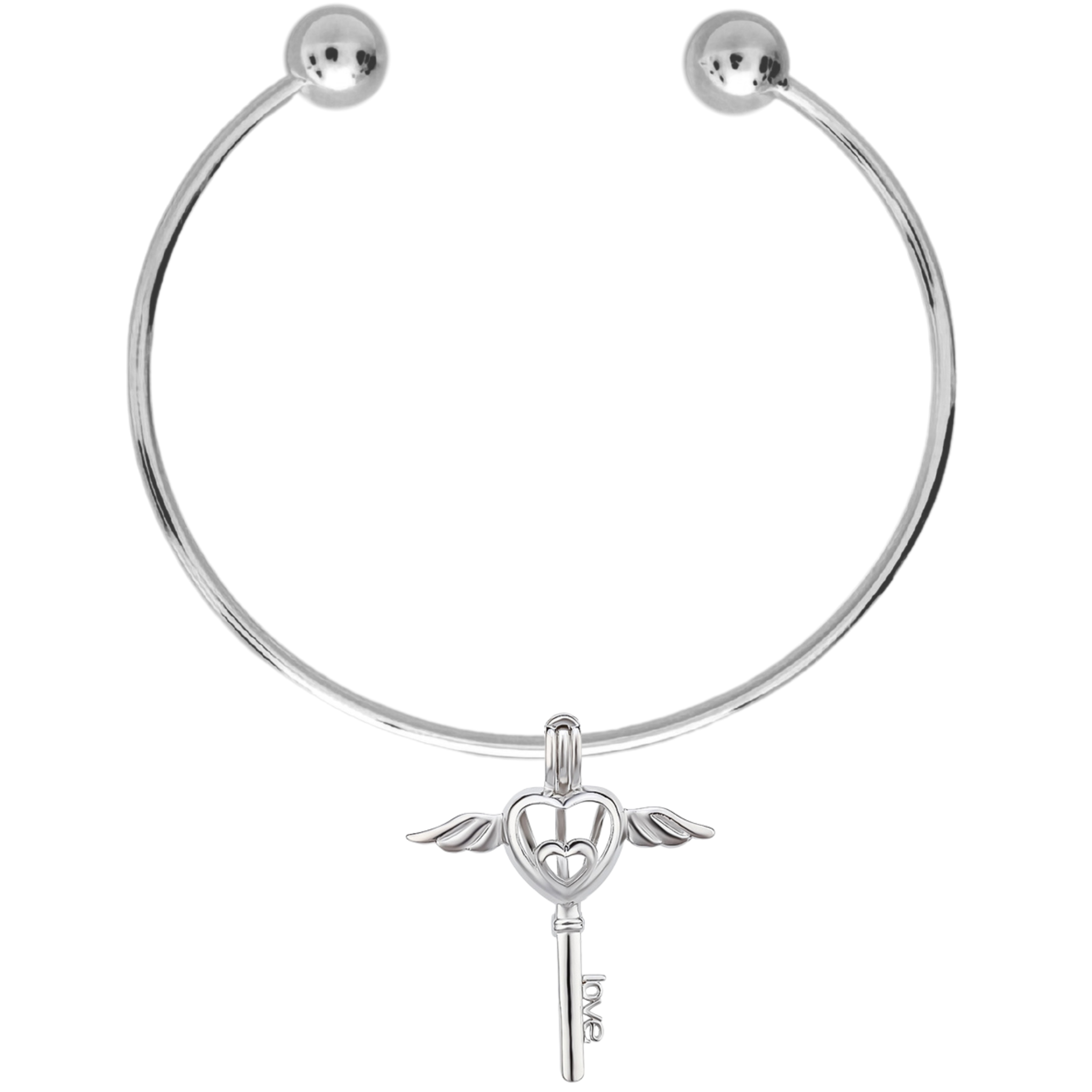 Crafted from polished stainless steel, this sleek bangle bracelet features a screw-off ball end for easy charm swapping. Each charm opens to securely hold a pearl inside, letting you personalize your look with your favorite pearls. Presented in a beautiful jewelry box, it makes a perfect gift or everyday accessory.