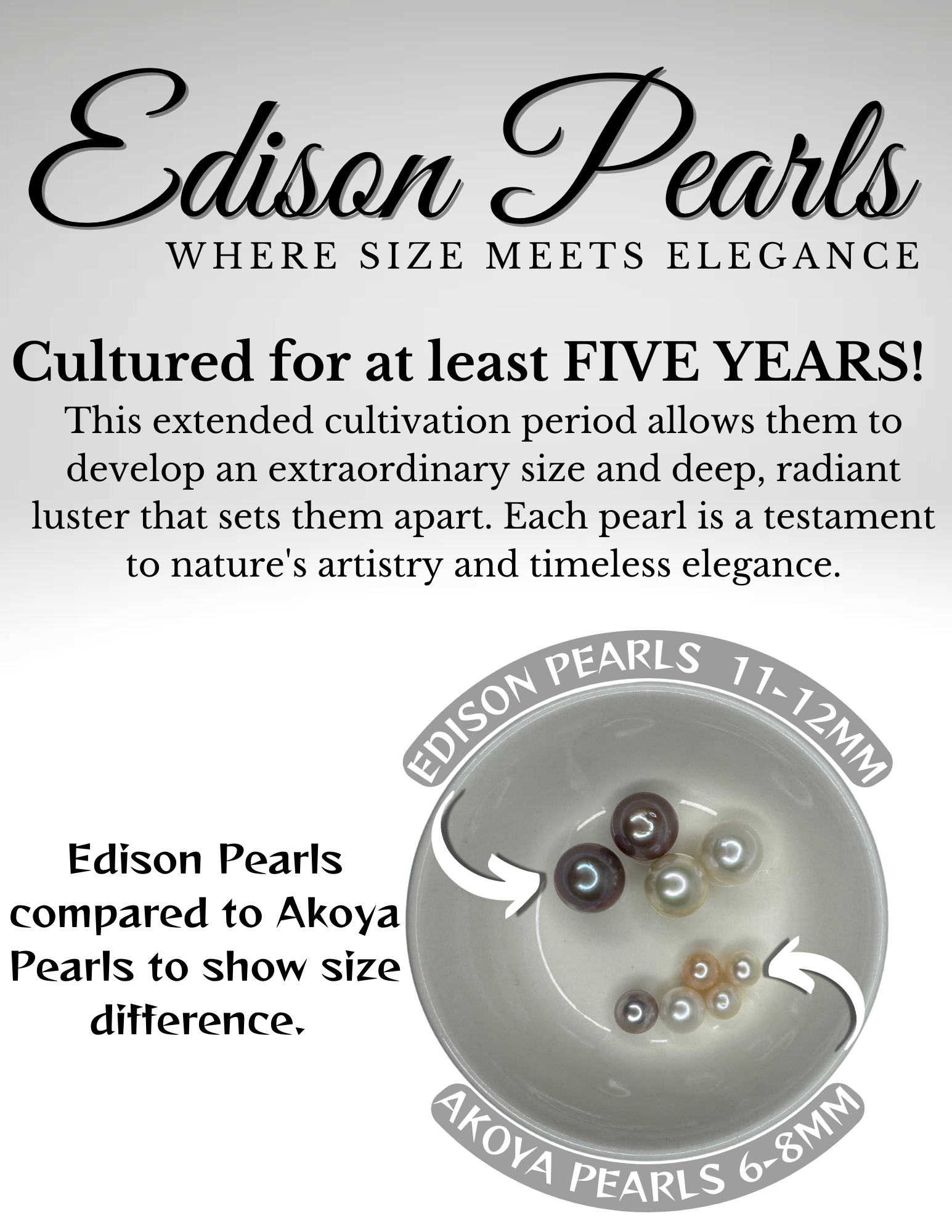 Edison Pearls have been cultured for at least 5 years and are 10-12mm in size...