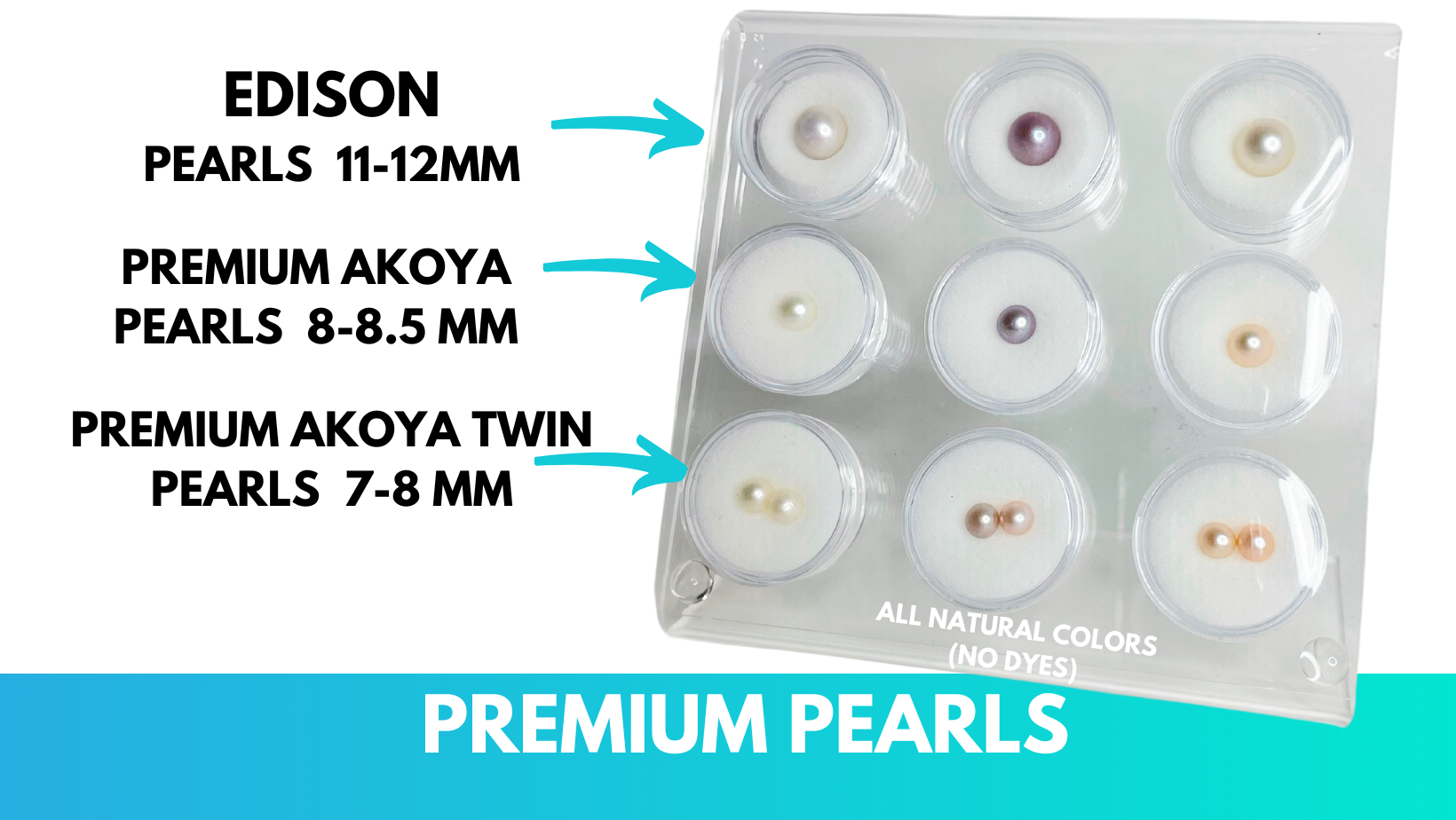 The PREMIUM PEARL assortment is the most valuable pearls assortment we have ever offered. It includes high grade Akoya Pearl, and Edison Pearls. The Akoya Pearls have been cultured for a minimum of 2 years, while the Edison are from a different pearl farm, and are cultured for at least 5 years.